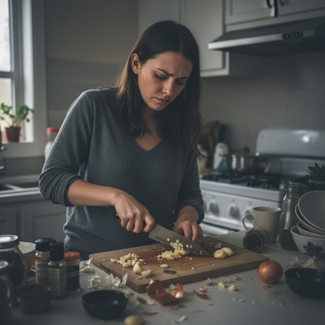 Passer 15 minutes à hacher l'ail finement, les yeux qui piquent avec les oignons, les doigts qui sentent pendant des heures 😤